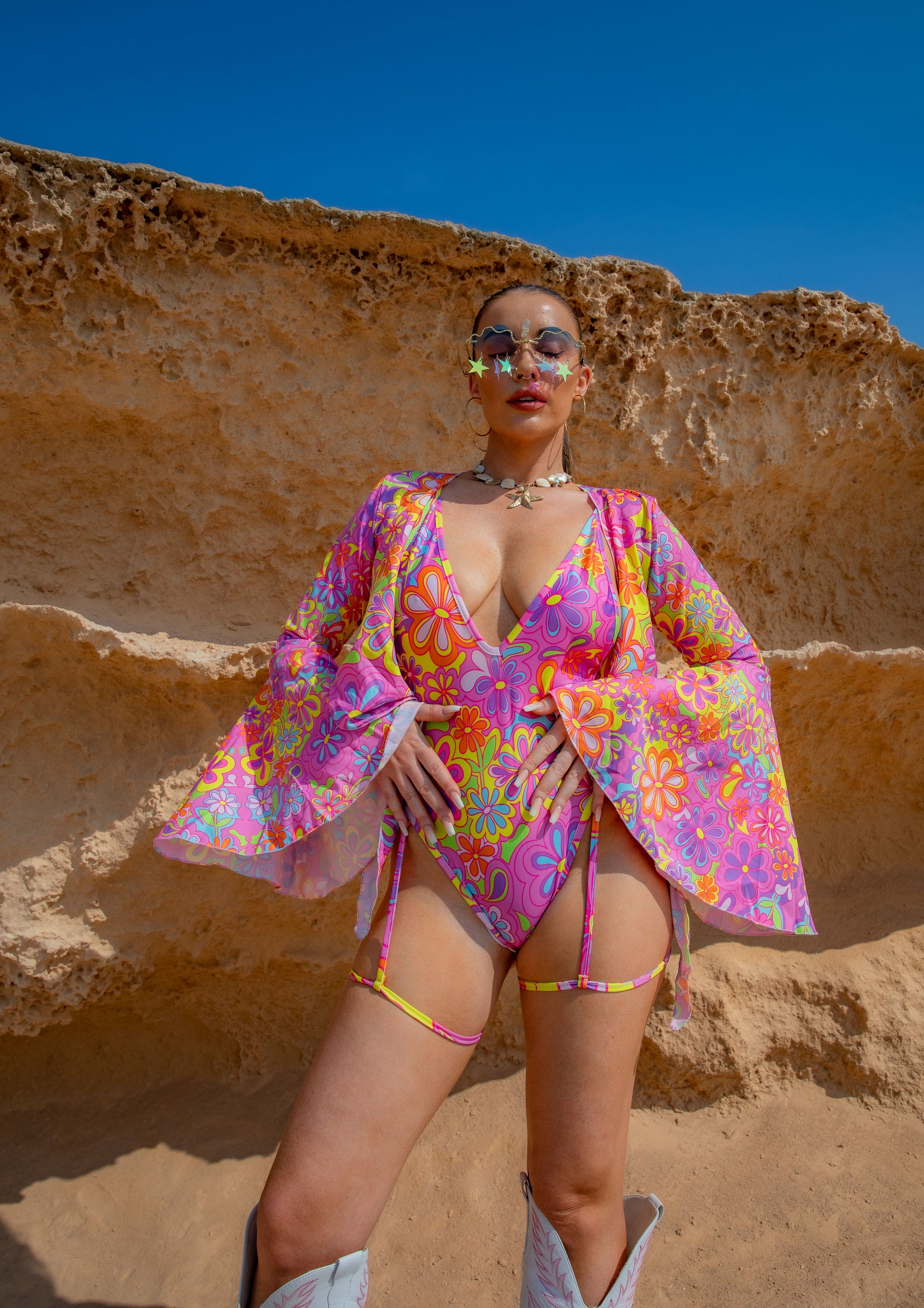 Groovy Bloom Bell Sleeve Cropped Tie Top