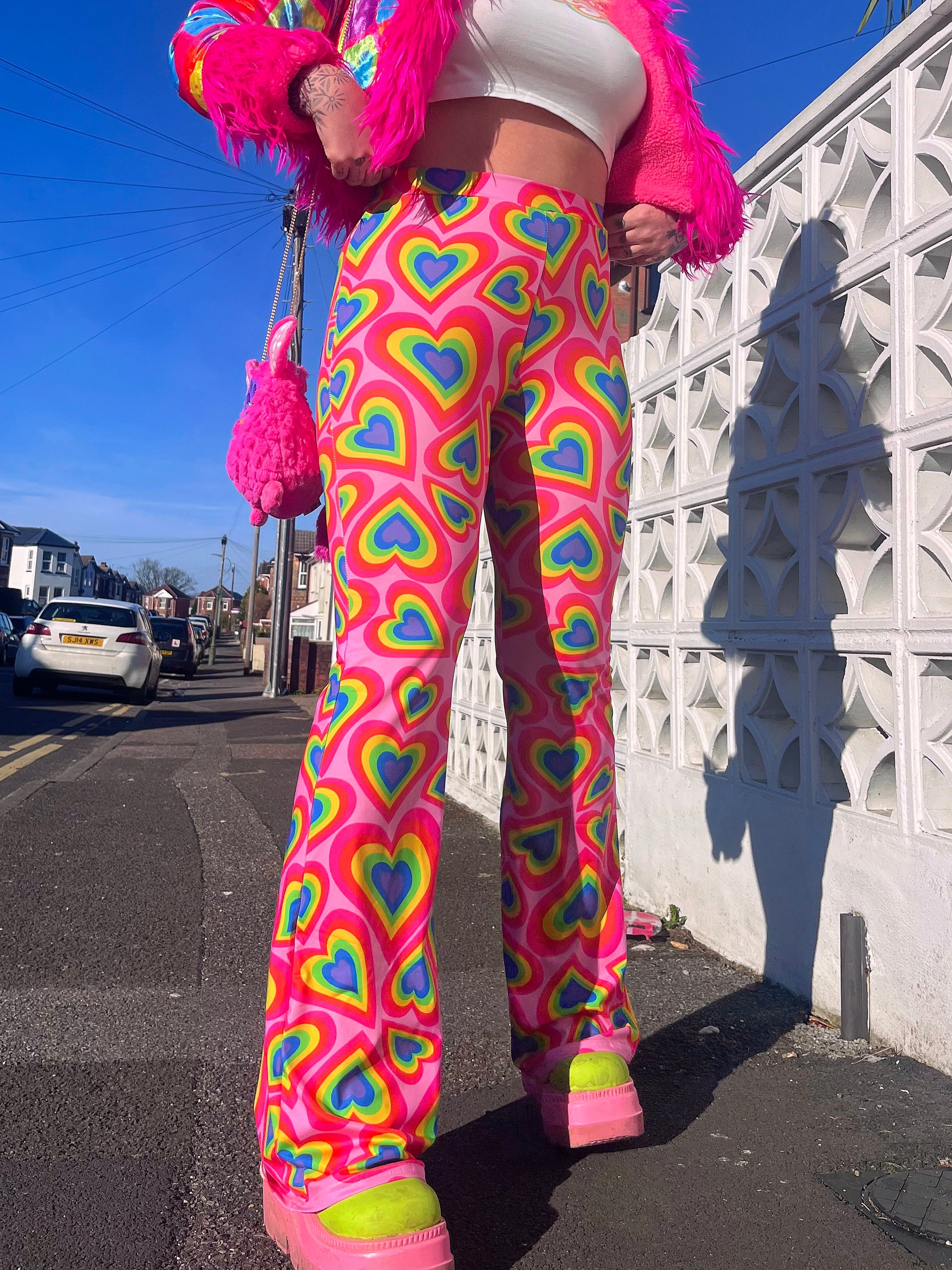 Elevate your wardrobe with these stunning high-waisted bell bottom flares, crafted from premium quality soft touch stretchy spandex. Designed for ultimate comfort and style, these flares feature a bold and vibrant print that’s sure to turn heads. The high-stretch fabric provides a flattering fit and maximum comfort, making them perfect for all-day wear. Whether you're rocking them for everyday errands or showcasing your festival spirit at raves and events, these flares are effortlessly chic and versatile. Step out in style and embrace the perfect blend of comfort and flair with these must-have bell bottoms!