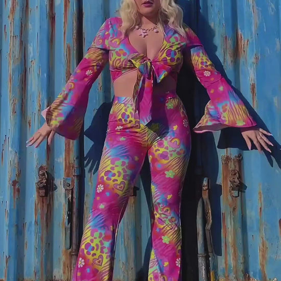 Elevate your wardrobe with these stunning high-waisted bell bottom flares, crafted from premium quality soft touch stretchy spandex. Designed for ultimate comfort and style, these flares feature a bold and vibrant print that’s sure to turn heads. The high-stretch fabric provides a flattering fit and maximum comfort, making them perfect for all-day wear. Whether you're rocking them for everyday errands or showcasing your festival spirit at raves and events, these flares are effortlessly chic and versatile. Step out in style and embrace the perfect blend of comfort and flair with these must-have bell bottoms!